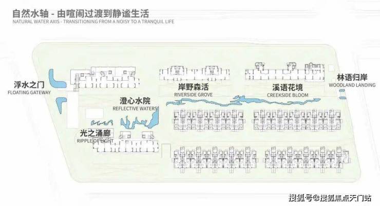 在社区内部,则通过一条自然水轴,串联六大景观节点,步步皆景。