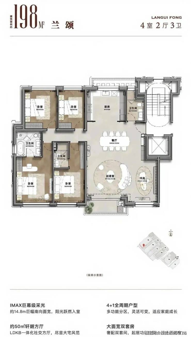 4+1全周期成长性户型,使家庭成员既可以共享社交空间,又拥有充足的私密领域,满足现代家庭多样化以及多代同堂生活需求。