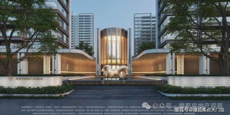社区主入口,约58米宽、约12米高的恢弘奢阔门庭,通过将社区整体抬高,形成悬浮于公园之上的视觉张力,一幅鎏金艺术画卷在眼前徐徐展开!