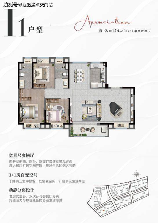 3+1房大开间设计,可根据居住需求升级为四房,灵动性高;