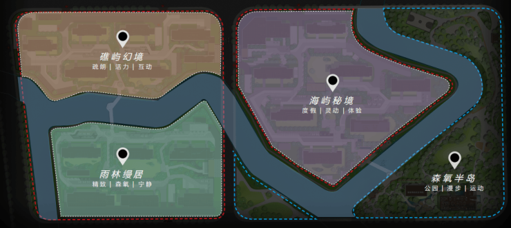 罕见双自然水系!一横一纵2条水系将项目地块一分为三,形成三座天然“岛屿社区”,这在市面上非常少见。