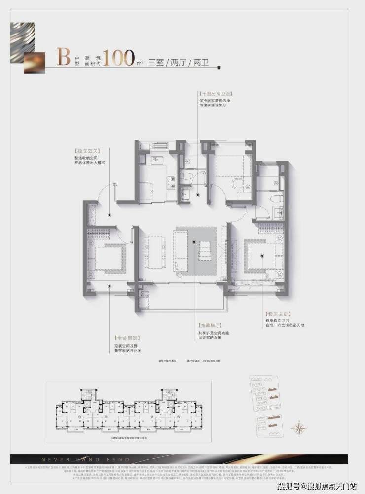 建面约100㎡的三房两厅两卫户型,可以说是约96㎡3房的升级版,空间更加延展,整体 横厅面宽约5.2米(轴中距),形成更大的南向采光面,且搭配南向观景阳台,直接做到了 3.5面宽朝南,这在同类产品中是比较少见的。