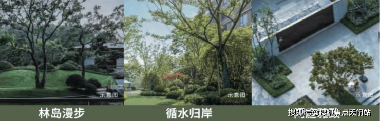 园林方面将围绕中央景观,以 现代艺术手法,打造 森林岛屿景观。内部设置 特色水景,串联不同节点。同时以树木、水系与局部连廊体系融合,共同组建起社区与居所之间的联通介质。