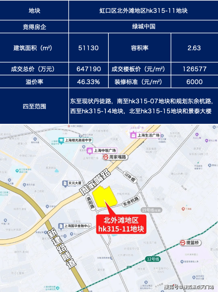金茂璞元,即虹口区C080302单元hk329-11地块,于2025年2月20日,由金茂&庆隆以896435万元竞得,成交楼面价117474元/㎡。项目容积率3.95。