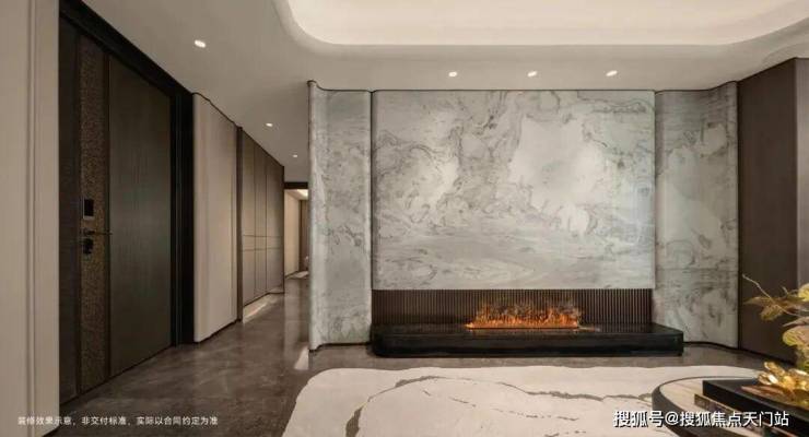 室内大量运用奢石,搭配统一木饰面与皮革材质,通过圆弧设计、隐形出风口、无高差客厨地面等“隐形美学”处理,让奢华与舒适完美融合。