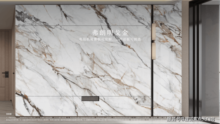 充分考虑业主的个性化需求,在电视背景板提供了新潘多拉、云中翡翠、弗朗明戈金三种结晶釉面岩板选择,成本更高,施工难度也更大。