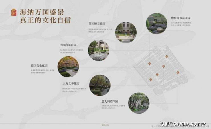 摩纳哥观星花园的地中海风情,英国悦享花园的文艺草坪,上海文华花园的海派诗篇,法国尚美花园的艺术交响,意大利英华园的现代叙事,德国美伦花园的理性协奏。