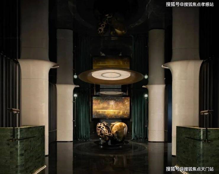 社区门头的设计同样非常有腔调,顶部是大面积弧形金属板,背景是通透玻璃和奢石景墙,对标奢华酒店门庭,营造出豪宅归家仪式感。