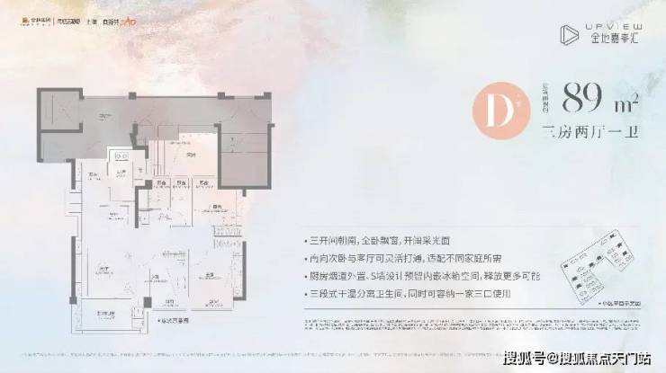 建面约89㎡三房两厅一卫(D户型),不仅功能完备,而且很好地把控了总价,约350万起即可上车高配品质三房,堪比市场上110平左右的空间感!