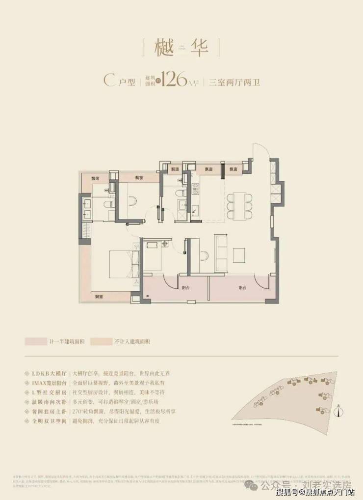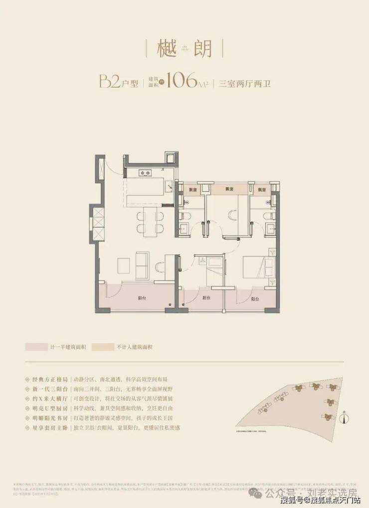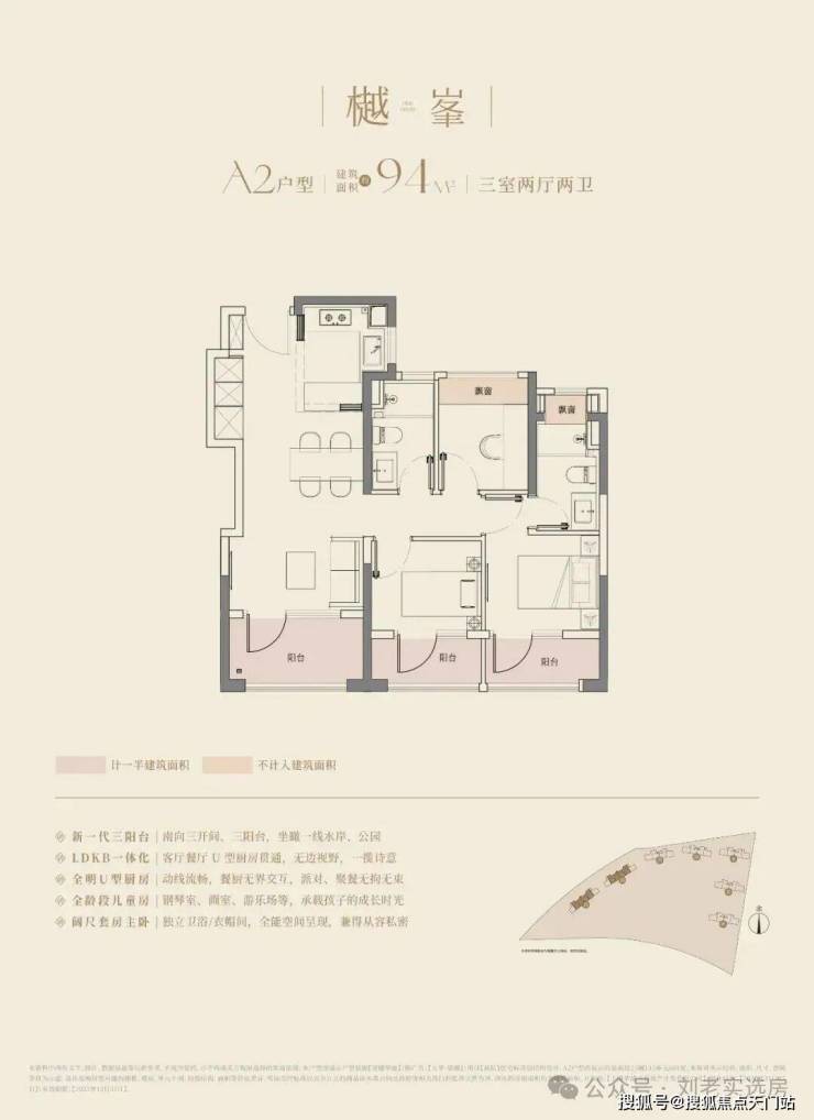 大华望樾建面约94㎡高层户型居然做到了三阳台的配置,远远超过新规标准。