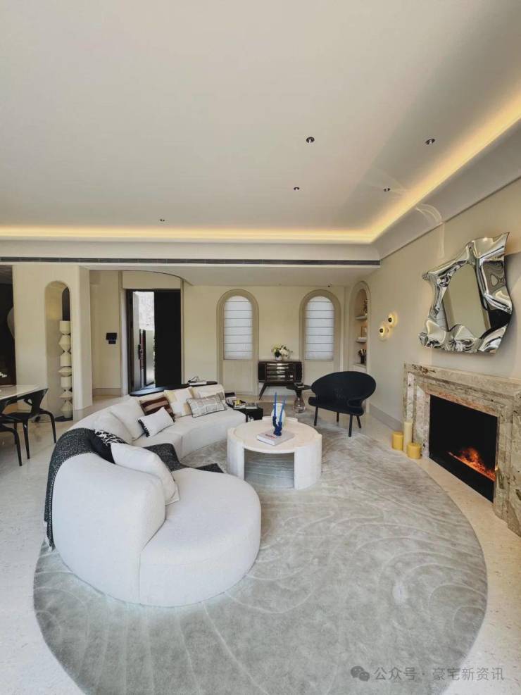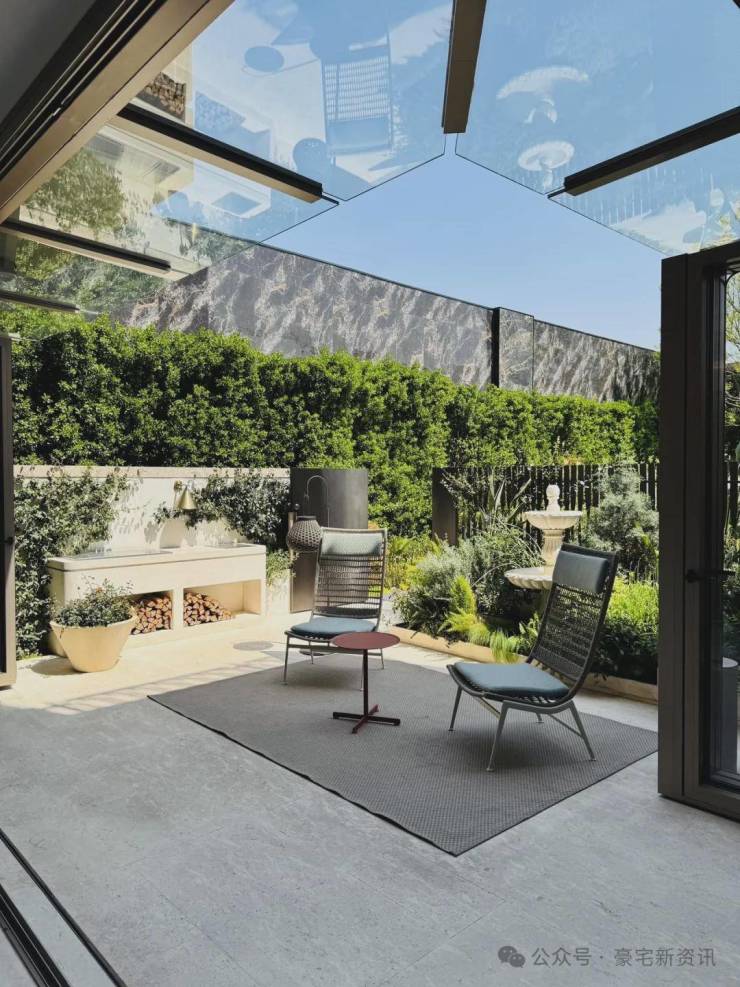 「无界空间」:客厅270度转角无柱设计,搭配落地玻璃,开阔视野将院中风景迎入日常。