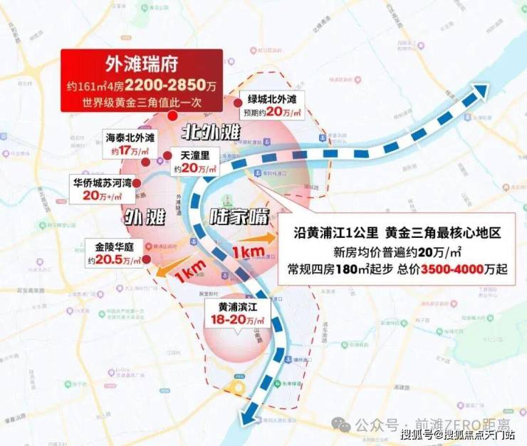 以大连路为起点沿黄浦江1公里画线,即世界级黄金三角最核心区域,如今在这片区域内,新房普遍20万/㎡上下,四房起步180㎡, 四房门槛预计3500-4000万起