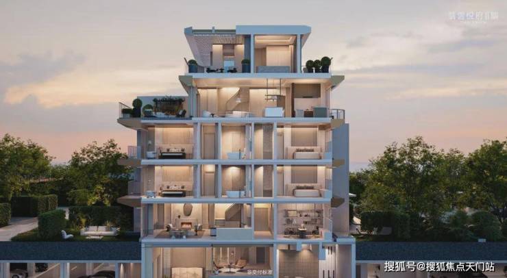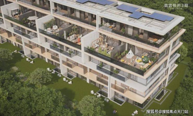 首先,项目以层层退台的流瀑五叠设计,把庭院从地面托举至云端,彻底终结 “上叠无院” 的历史。