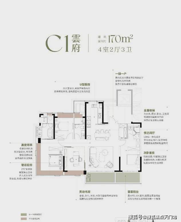 建面170㎡“悬浮全景舱”户型:—— 南向 15.8 米四面宽让每个空间都享阳光平权,深 U 型厨房预留西厨岛台,约8.35 米双阳台兼顾功能与情绪价值,双套房 + 270° 全景窗 + 三卫设计,更将 “新平权主义” 落到实处,让每位家庭成员都有私密空间;