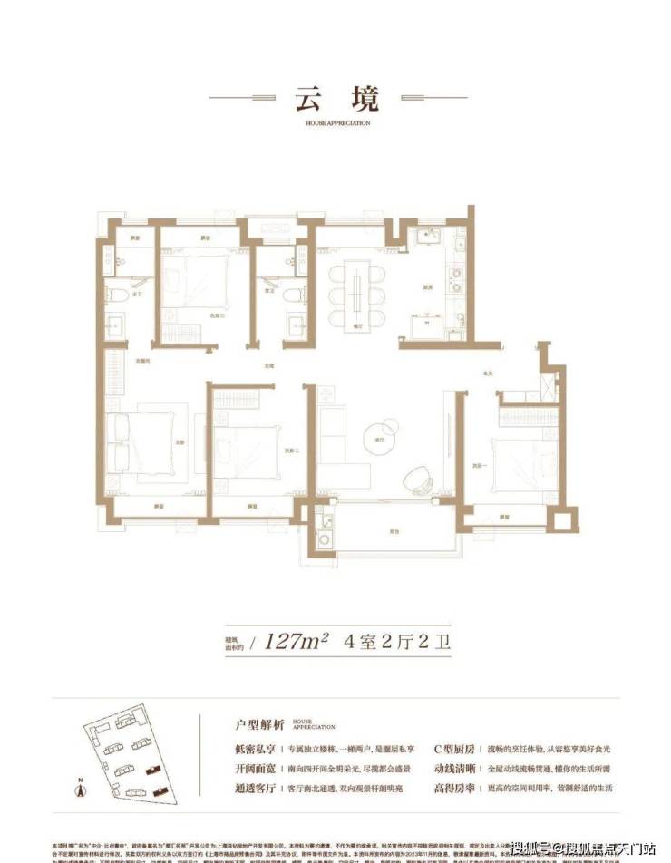 约 127㎡的 4 房 2 厅 2 卫户型,则更为宽敞大气。四个房间分布科学,既保证了各自的独立性与私密性,又便于家庭成员之间的交流互动。主卧配备独立卫生间和衣帽间,为业主带来尊贵的居住体验。客厅与餐厅相连,开阔的空间能容纳一家人的欢声笑语,是家庭聚会与休闲娱乐的绝佳场所。