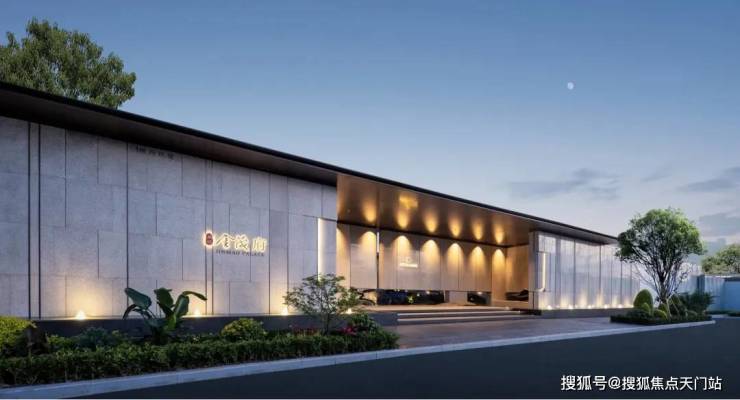 门头延续了金茂府的隐奢审美, 约40米宽、5米高的宽景大门 , 搭配石材铝板组合以及灯带氛围营造,在立面上形成层次感。