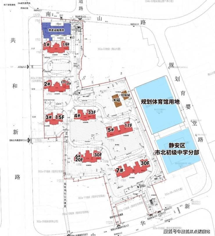 而北侧靠近南山路一侧还规划一幢最高6层的养老设施用房。在小区南北两侧的中华新路和南山路分别设有机动车出入口。