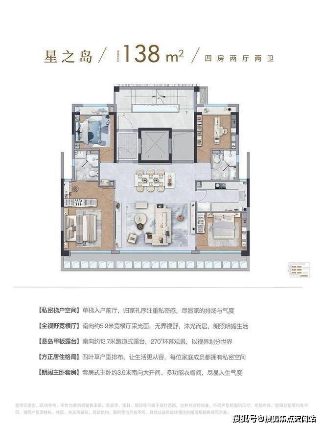 这个四房虽然建面只有138㎡,但因为是5层叠墅的高得房率,以及室内空间的高效利用,其功能和尺度感,给人的感觉十分惊艳。