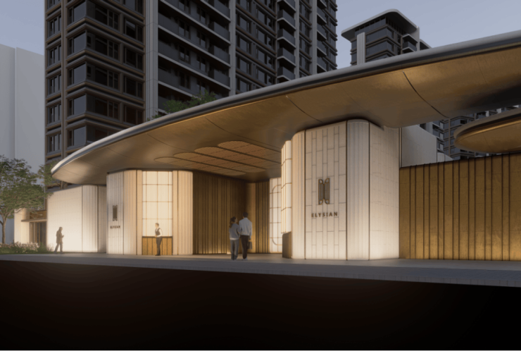 蓝灰色玻璃+仿石铝板+艺术涂料材质,穿插优雅线条,让建筑这张“脸”看起来更高级。One&Only酒店式门头。用雕塑体块、温润弧面和雅致线条,营造具有艺术格调的归家仪式感。