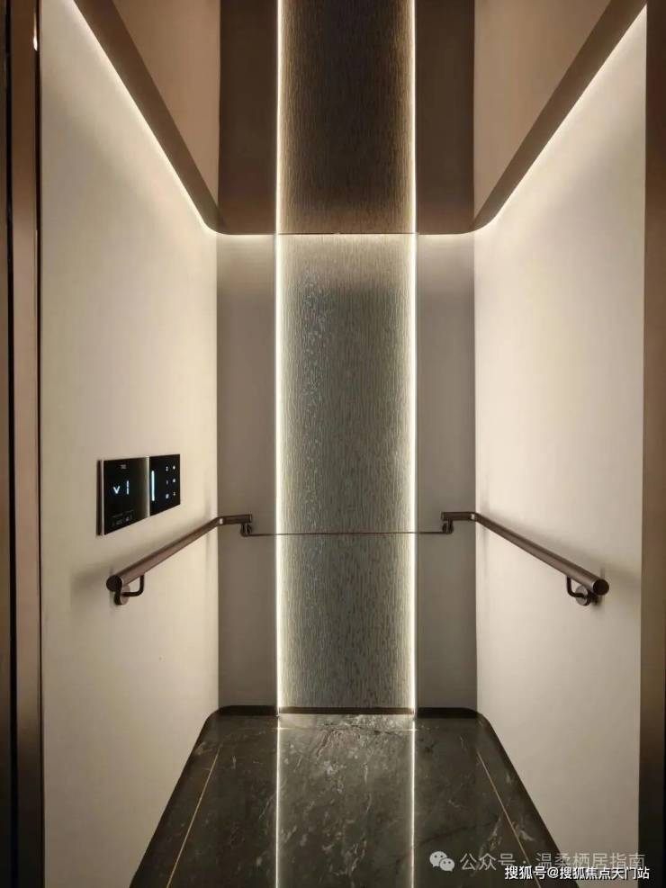 再来看看项目的样板间,还没有进入到样板间内就能感受到扑面而来的尊崇感了,这个是项目约200㎡下叠户型的电梯,市面上大多小区的公区电梯可能都没有它做的好,而且它还是一梯一户的设计,极具私密性!