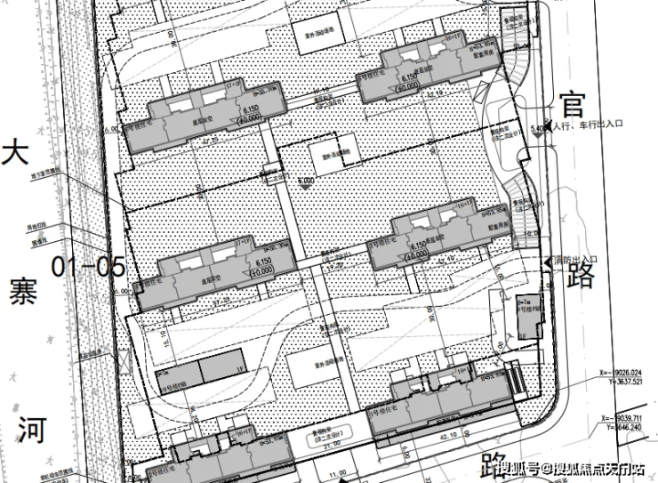 01-03(中间),规划10幢楼,其中一幢为保障房,总高17-18-20层,小区中心位置的商品一楼为架空层,南北楼间距30米。