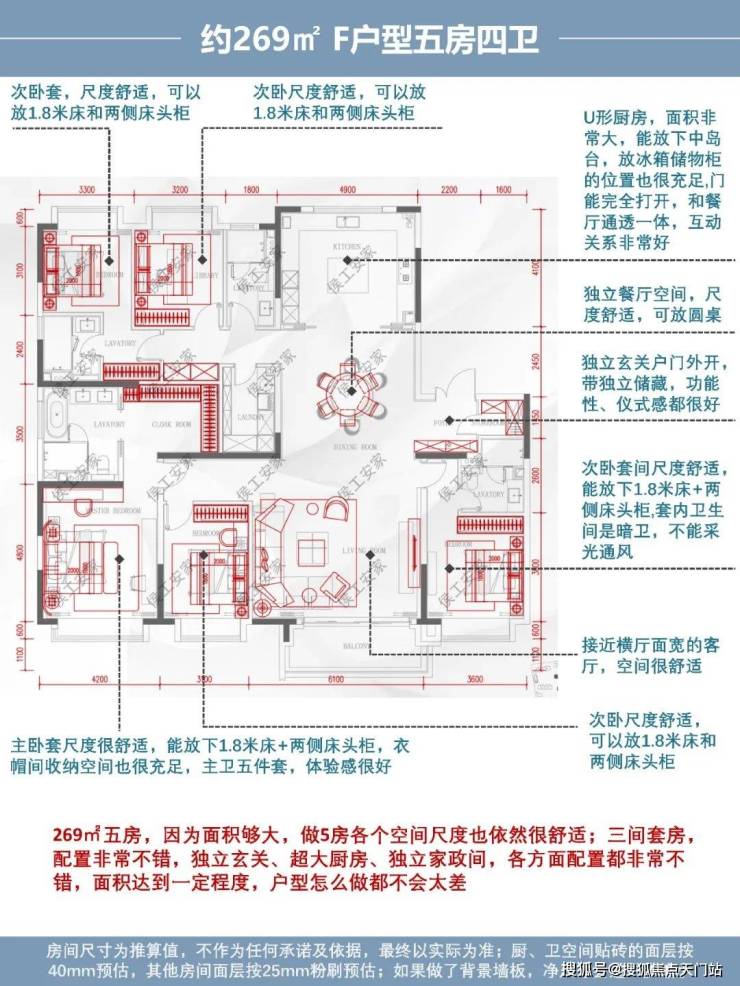 综合评价:269㎡五房,因为面积够大,做5房各个空间尺度也依然很舒适;三间套房,配置非常不错,独立玄关、超大厨房、独立家政间,各方面配置都非常不错,面积达到一定程度,户型怎么做都不会太差
