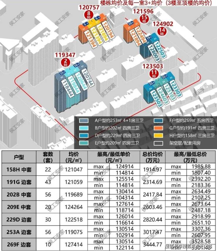 A户型约253㎡ 4+1房三卫56套;B户型约202㎡ 四房三卫56套;D户型约229㎡ 四房三卫30套;E户型约209㎡ 四房三卫 20套;F户型约269㎡ 五房四卫10套;G户型约191㎡ 四房三卫43套;H户型约158㎡ 三房三卫22套