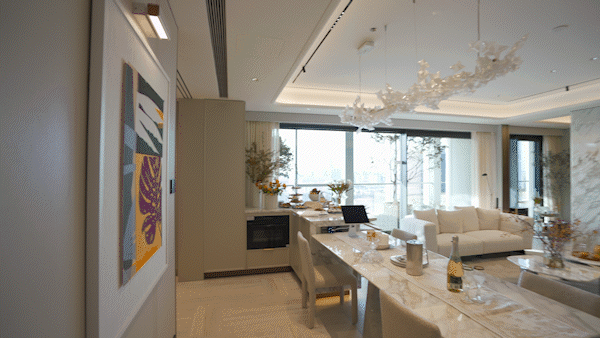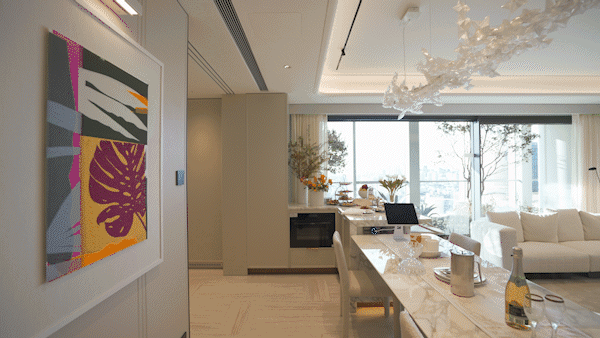 另外,因为豪宅客户对于精装美学有自己的审美,所以此次项目提供了超越行业的 三大柔性定制 ——艺术家联名定制入户门把手、艺术家联名定制艺术门牌挂画以及墙面饰面&岛台等区域提供多款石材/岩板款式。
