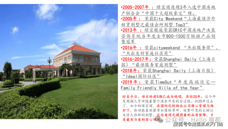 绿宝园别墅位于南汇康桥开发区,奠基开工于1999年,占地近40万平方米,迄今共推出5期产品及“绿宝.馥庭”,经过多年的开发已成为上海成熟高档的别墅社区之一,曾连续三年被评为“亚洲十大豪宅”,其多年来以纯正的美式规划,美式物管等西方的概念和执行。项目从规划之初即定位于打造具有北美风格、以外籍客户为主的涉外高档社区,在知名规划与设计团队的主导下,致力于高标准的设计、高品质的建筑、经验丰富的管理团队为住户提供全新的生活标准。