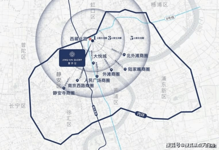 项目步行约200米即达8号线地铁站,5轨交汇,3站直达人广,5站陆家嘴。约1公里内静安大悦城、苏河湾万象天地等顶流商业环伺,苏州河滨水步道、中兴公园、三甲医院与优质教育资源触手可及。