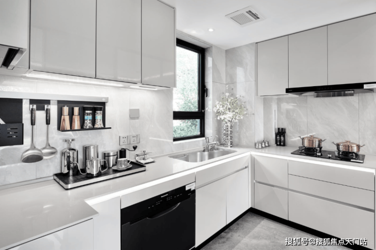 餐客厅踢脚线和厨房门框均为金属材质,开关面板全部定制同色系,把房屋美学做到极致……