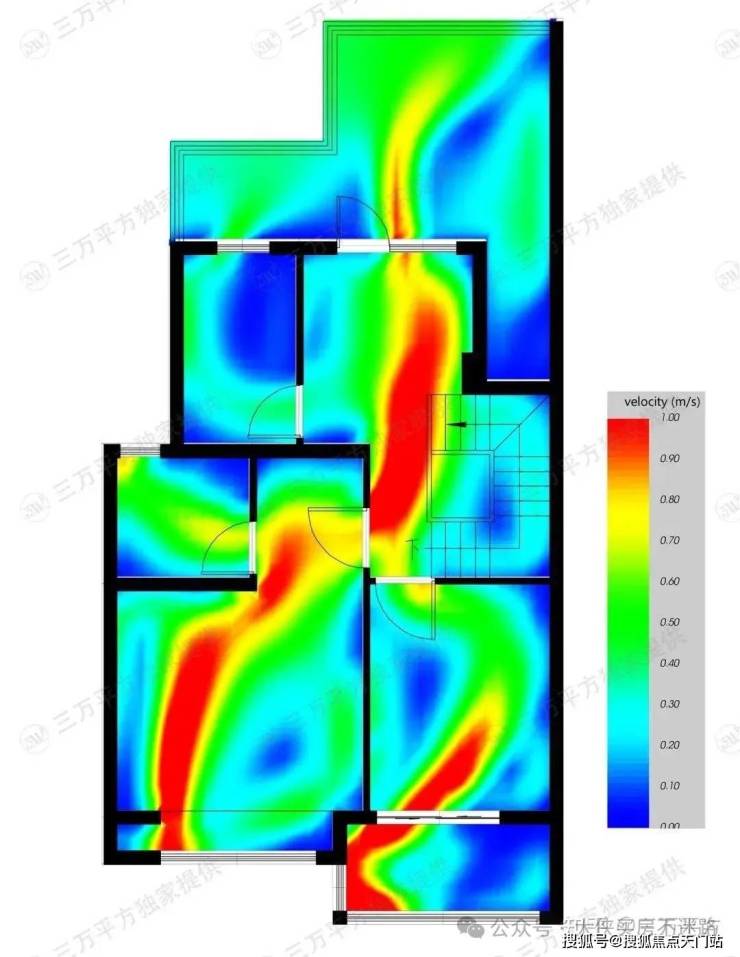 【通风性能】——二开间双层叠墅设计,在3F把餐厅客厅两开间相结合,餐客厅一体化形成较为开阔的生活空间利于通风。几乎做满面宽的飘窗和阳台为通风创造了良好的条件。整个户型四个基本生活空间均有良好的通风带,户型南北通透,建筑南北两侧的风压差结合户型自身优势,使得通风效果十分优异。