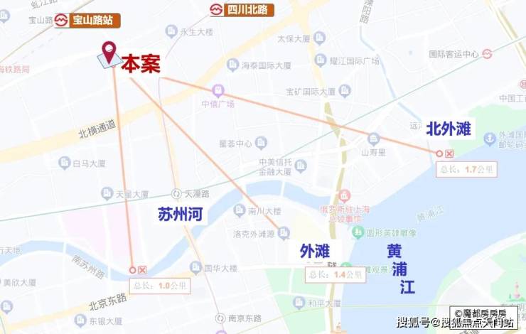 仅从图上看,该地块直线距 苏州河约1公里,直线距 外滩约1.4公里,直线距 北外滩约1.7公里,直线距 3/4号线宝山路站约300米,直线距 10号线四川北路站约560米,区位优势明显。