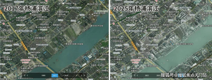 作为黄浦江畔的压轴板块,杨浦滨江的建设速度是有目共睹的,下图是2017-2025年杨浦滨江的卫星影像变化图,几乎是一年一个样!