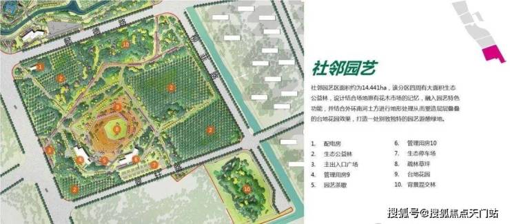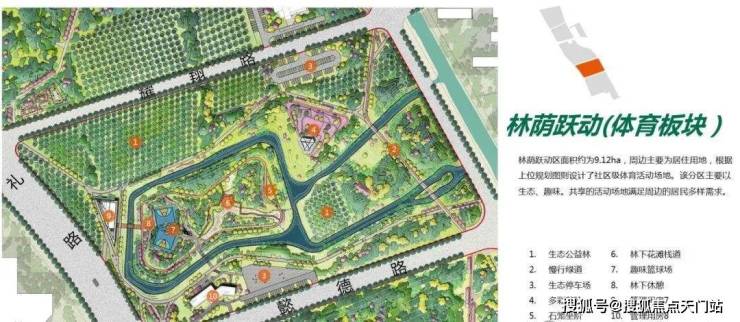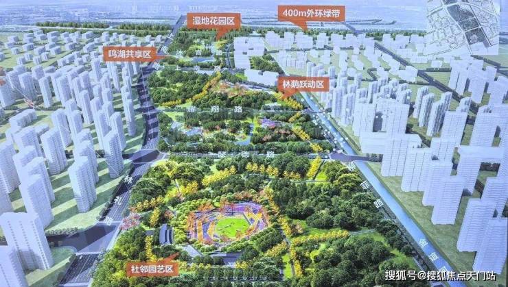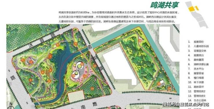 整座公园(在建中)划分为:湿地花园区、鸣湖共享区、林荫跃动区和社邻园艺区,四大功能分区。
