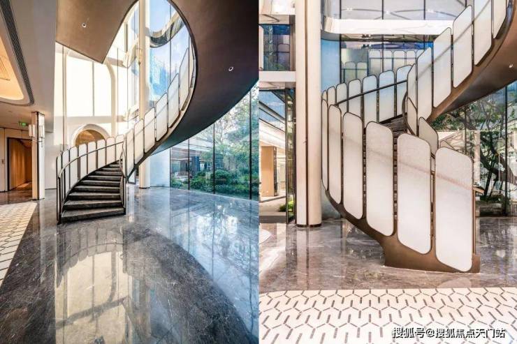 过去在豪宅项目才能看到的类似于“星空顶”地下车库坡道,招商臻境使用了看来更加高级的香槟金色吊顶,并加上穹顶闪耀的“追光”坡道!精装的地下大堂,配置了自然的采光井以及专属等候区,如同高级酒店的首层大堂,极尽礼宾仪式!精装地上大堂,地面的石材拼花造型,墙面的石材背景,将静奢海派的艺术展现的淋漓尽致!