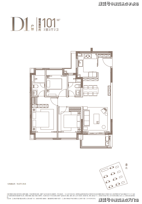 其中,主力建面约100、101平方米的3房2厅2卫: