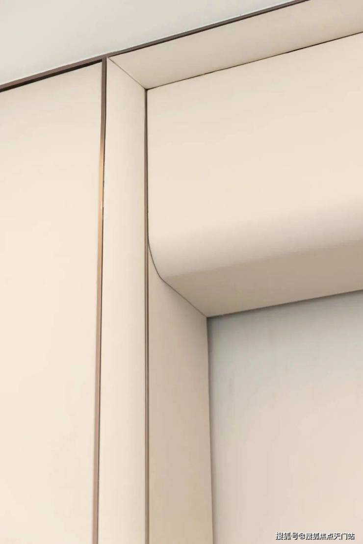 踏入样板间的第一秒,你会发现这里 几乎“看不到一个直角”:墙面转角、吊顶边缘、门套线条,甚至石材台面与柜体边缘,均以流畅圆弧替代生硬直角。