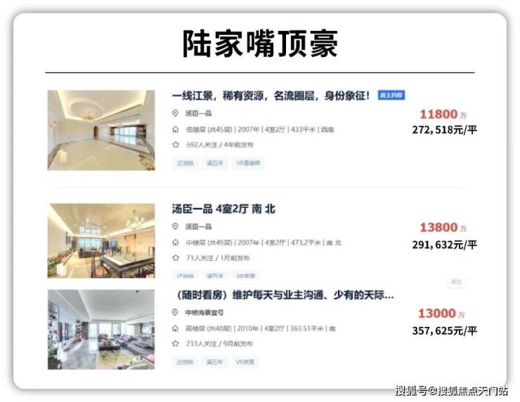 上海本土顶豪中,汤臣一品(陆家嘴)高区江景二手房27-30万/㎡,中粮海景壹号一线江景20-35万/㎡,绿城黄浦湾(外滩)一线江景24-33.6万/㎡。
