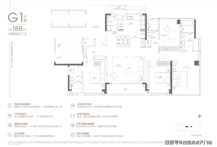 188户型 2梯2户,有独立的电梯厅。4房3卫设计,还是3明卫,这两点还是不错的。