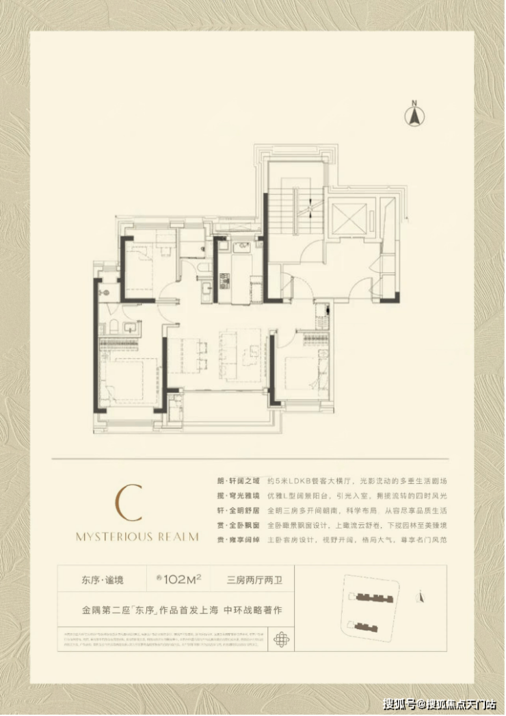 【约102㎡样板间】三房两厅两卫格局,同样的布局设计巧思应用于102㎡,打造出近乎双套房的生活体验。5米面宽横厅设计,营造极致通透感,臻选奢石融入空间,优雅时尚。厨房科学动线设计,搭配国际品牌五金和厨电,悦享精致烹饪时刻。星级主卧,独立卫浴,将空间最大程度延伸,打造舒居体验。