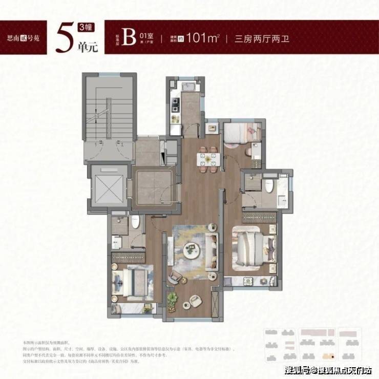 建面约100-101㎡户型, 拥类独立电梯厅,无连廊+飞机户型南北通透。