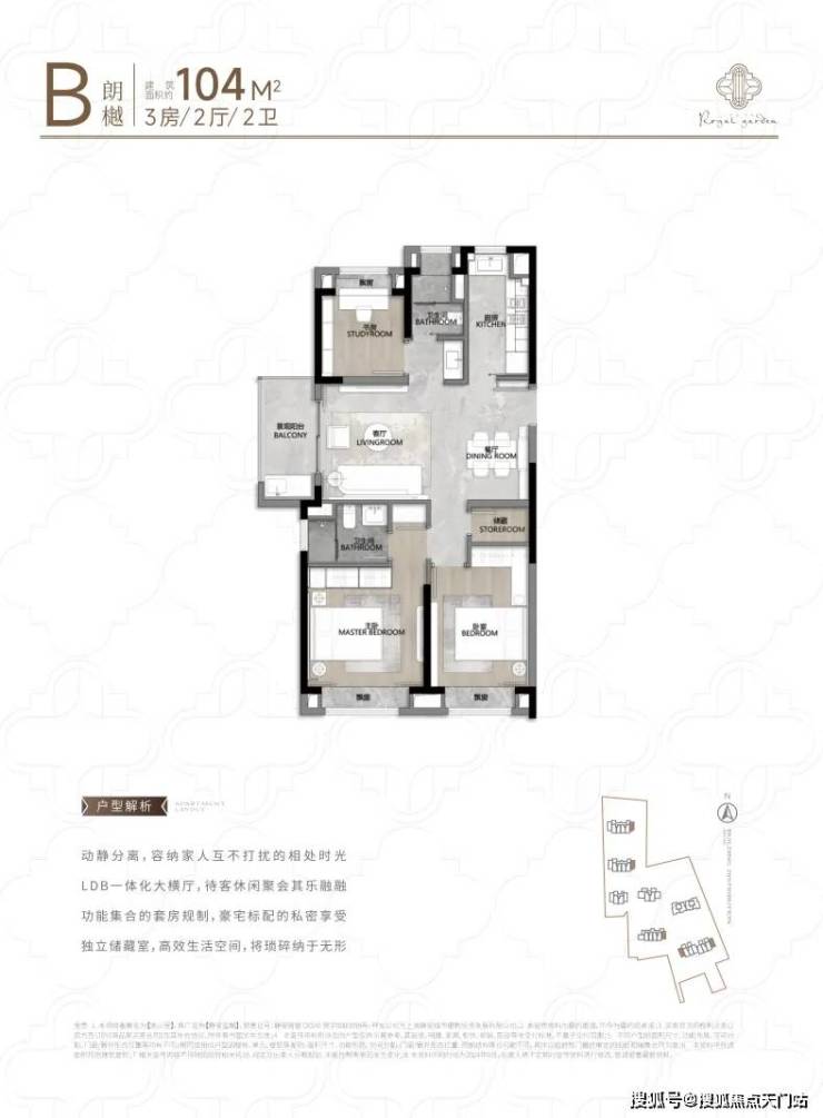 适合三口之家或年轻家庭居住的动静分区户型,厨房、餐厅、客厅及阳台一体化设计,动静完全分区设计,相当人性化!主卧套房设计满满尊崇感;次卫三分离干湿分区设计,考量十分贴心!
