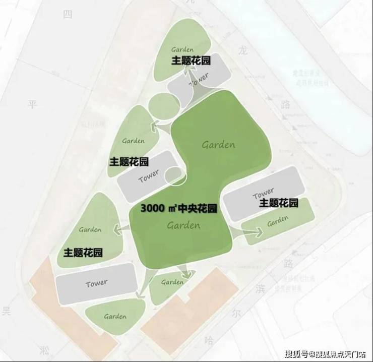社区景观上,突破市区项目常见的「兵列树阵式」布局,通过建筑楼体的精密偏转,形成罕见的 围合式 社区形态。