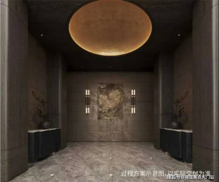 约50m面宽的气派门头+酒店式入户大堂, 打造艺术格调归家。入户大堂由吴滨设计,呈现“天圆地方”的效果,方正的线条勾勒出空间的规整与大气,与顶部的圆形形成刚柔并济的视觉平衡,让每一次归家都成为一场尊贵的礼遇。