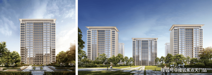 外立面采用经典时尚现代主义风格:通过温和的色彩搭配、简练的横向线条、黄金比例的立面比例、极简抽象的建筑符号、建筑顶部的飘板,呈现一个现代风格和艺术气质结合的高品质社区。