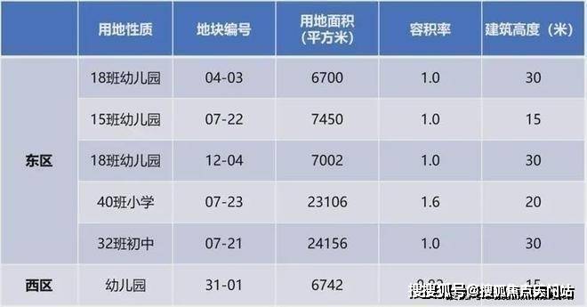 东区和西区最大的不同在于教育和公建设施配套,东区人口更密集,有5幅教育用地,从幼儿园至初中;而西区仅有1幅教育用地,作为幼儿园.