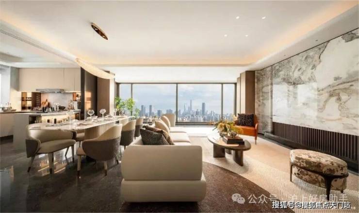 餐客厅面积约93㎡、进深7.6m; 客厅无界阳台,对望上海地标天际线;
