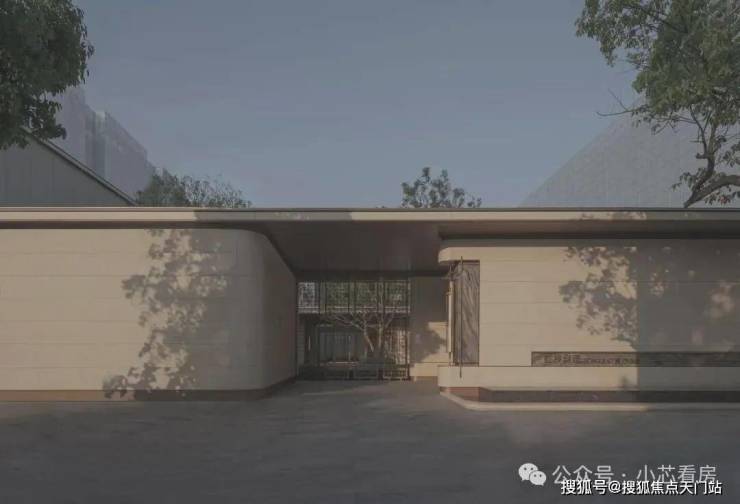 社区入口设计以“隐奢”为核心理念,摒弃传统豪宅项目的张扬符号,转而通过材质、比例与空间叙事的精准把控,传递低调中的精致感。主入口并未采用高耸的门楼或繁复的装饰,而是以米黄色石材与香槟金色金属格栅的组合,构建出克制而优雅的视觉语言。