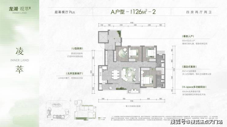 户型亮点: 四转角采光空间,奢享双套房,建面约126㎡ ,得房率约107%。